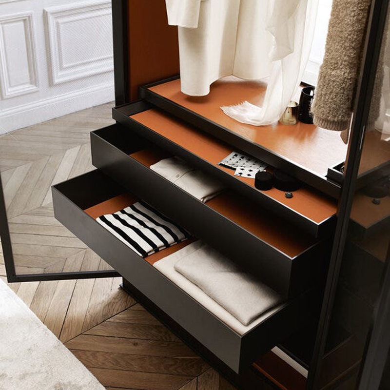 Innen mit Leder beschichtet inkl. Fachböden und Schubladenelement, melaminbeschichtetes Leder